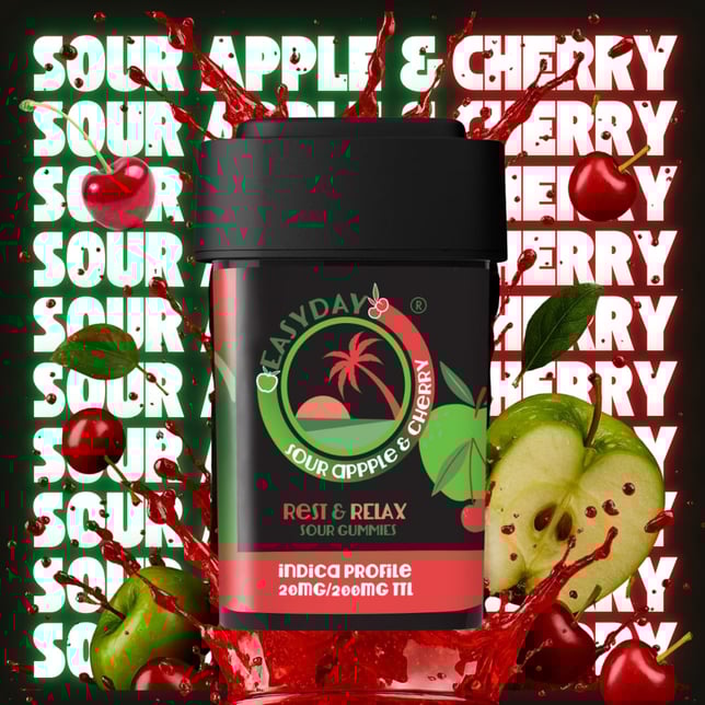 Find your evening peace with Sour Apple and Cherry Rest & Relax gummies. The crisp tang of sour green apple perfectly complements sweet, ripe cherry in these calming treats. Infused with indica-dominant terpenes for deep relaxation and stress relief.
