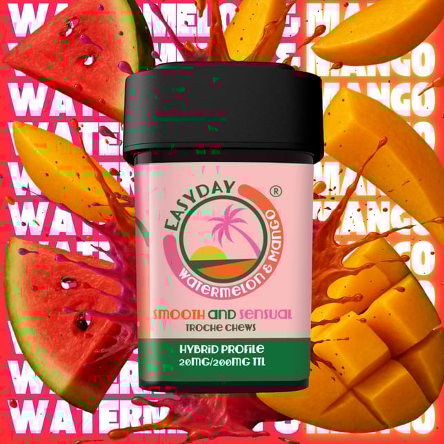 Indulge in the exotic combination of watermelon and mango with our Smooth & Sensual hybrid chews. These premium gummies feature Watermelon OG terpenes that create a perfectly balanced experience - relaxing yet uplifting, making them ideal for intimate moments or creative pursuits.